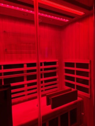 My visit to the sauna studio was a letdown at best. I quickly realize that the one strip of red light from the ceiling will not meet my PT’s specific requirement: the light should be as close to your skin as possible. Sadly, I realize the studio sauna lighting is not satisfactory.